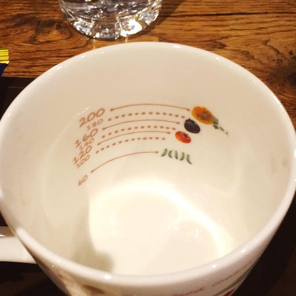 試食に際して、マグカップの説明。お湯のメモリがついていて、正確な分量で作ることができる。便利!