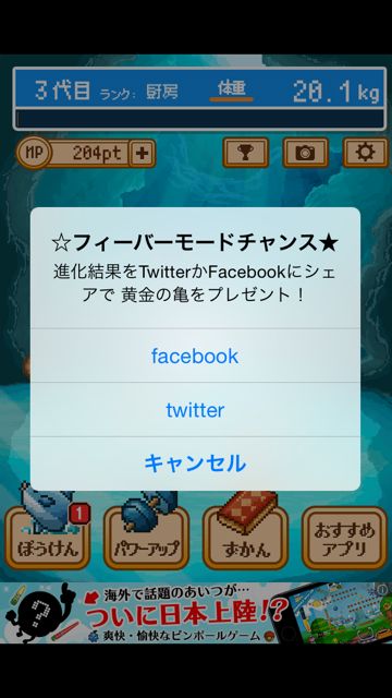 一定以上の体重になると進化します。進化した時にTwitterやFacebookにシェアすると餌が大量に出てくる「黄金の亀」モードになります。これがTwitterを賑わせていた原因のようですね。あんまりシェアするのは好きじゃないのだけど、それでゲームが進むのであればやってしまいます。単純なだけに抜群の効果だろうね。ここで「マンボウ」である事も活きてきます。