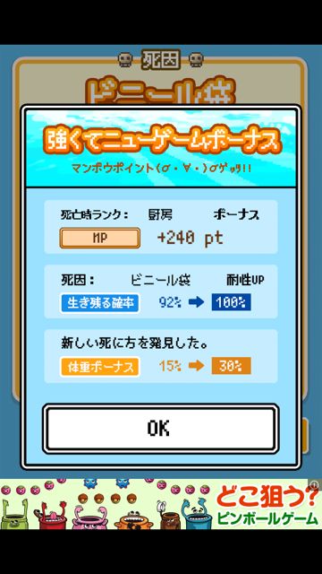 ひたすら食べていれば体重は増えていきますが、油断は禁物です。クラゲだと思って食べたらビニール袋だったっり、イカを食べ過ぎて消化できなかったりして「実際の死」を向かえます。実際にマンボウの身に起こりえる死因が採用されているため、死ぬごとにマンボウ雑学を知る事ができます。そんなことで死ぬの?みたいな。